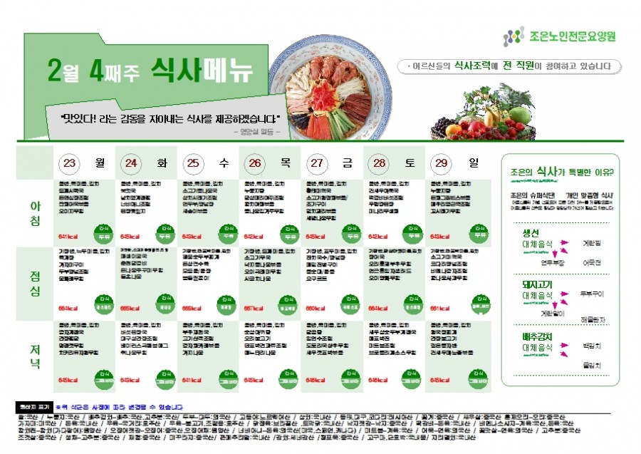 2월 넷째주 식단표 2026.02.23 | 관리자 관련링크 이전글 다음글 목록 본문 *식단은 식자재 수급 현황에 따라 변경될 수 있으니 양해 부탁 드립니다. 즐거운 식사 시간 되세요~♥ 목록
