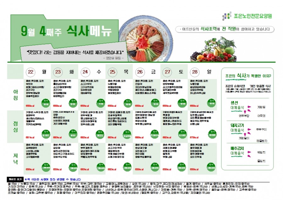 9월 넷째주 식단표 2025.09.22 | 관리자 관련링크 이전글 다음글 목록 본문 *식단은 식자재 수급 현황에 따라 변경될 수 있으니 양해 부탁 드립니다. 즐거운 식사 시간 되세요~♥ 목록