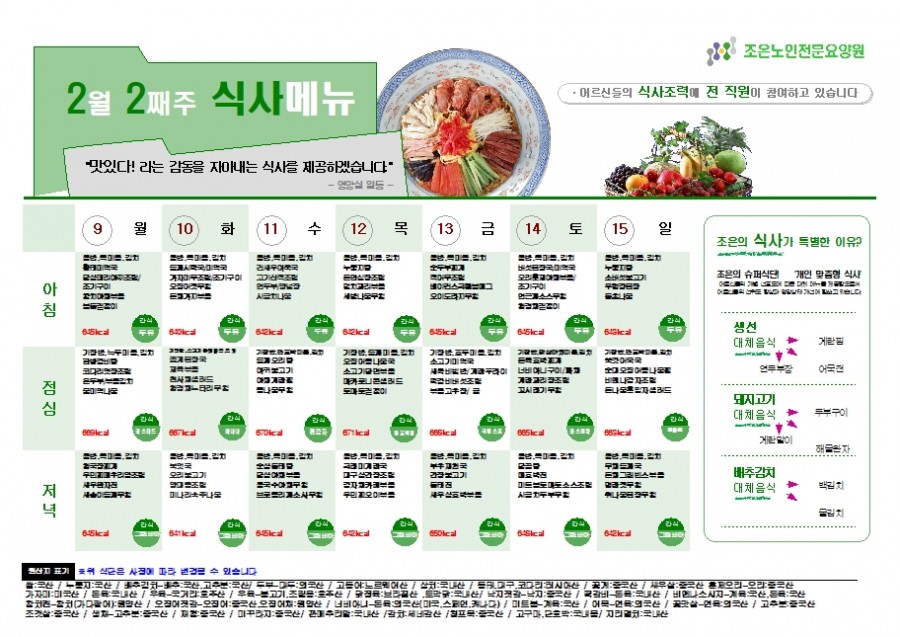 2월 둘째주 식단표 2026.02.09 | 관리자 관련링크 이전글 다음글 목록 본문 *식단은 식자재 수급 현황에 따라 변경될 수 있으니 양해 부탁 드립니다. 즐거운 식사 시간 되세요~♥ 목록