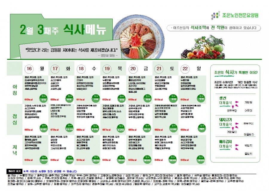 2월 셋째주 식단표 2026.02.16 | 관리자 관련링크 이전글 다음글 목록 본문 *식단은 식자재 수급 현황에 따라 변경될 수 있으니 양해 부탁 드립니다. 즐거운 식사 시간 되세요~♥ 목록